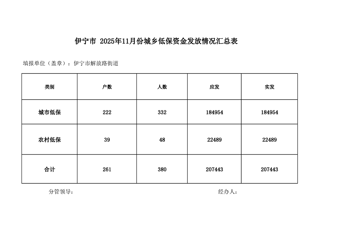 解放路街道 2025年11月份城乡低保发放情况汇总表