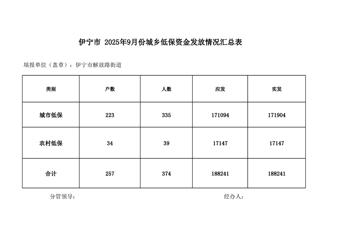 解放路街道 2025年9月份城乡低保发放情况汇总表
