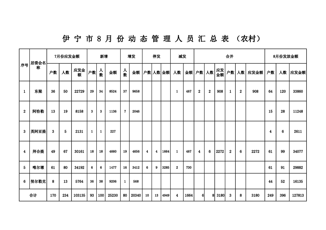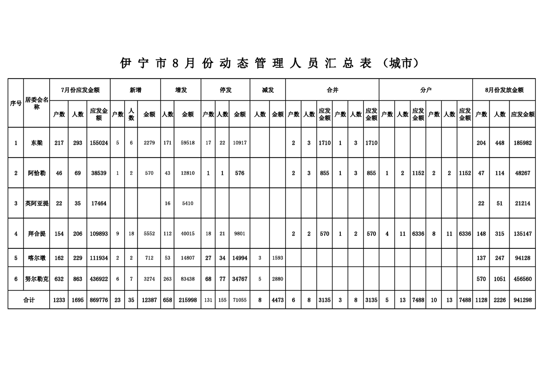 伊宁市琼科瑞克街道2025年8月低保动态汇总表