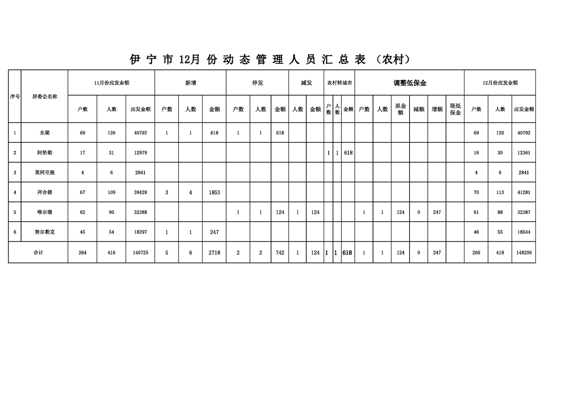 伊宁市琼科瑞克街道2025年12月低保动态汇总表