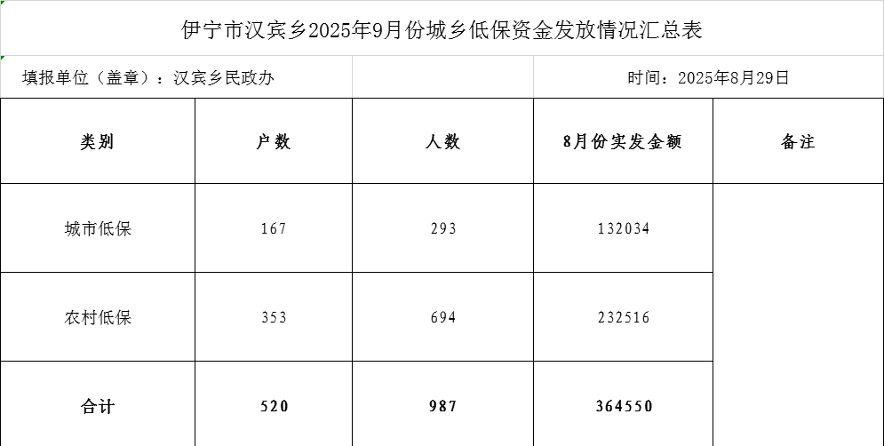 伊宁市汉宾乡2025年9月份城乡低保发放情况汇总表