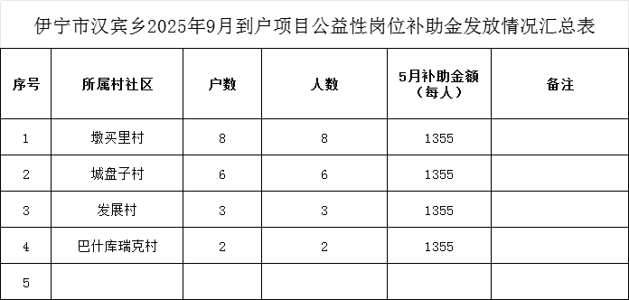 伊宁市汉宾乡2025年9月到户项目公益性岗位补助金发放情况汇总表