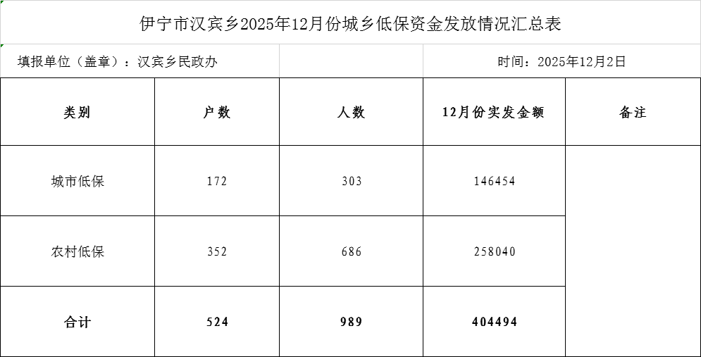 伊宁市汉宾乡2025年12月份城乡低保发放情况汇总表