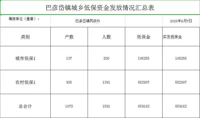 伊宁市巴彦岱镇城乡低保资金发放情况汇总表