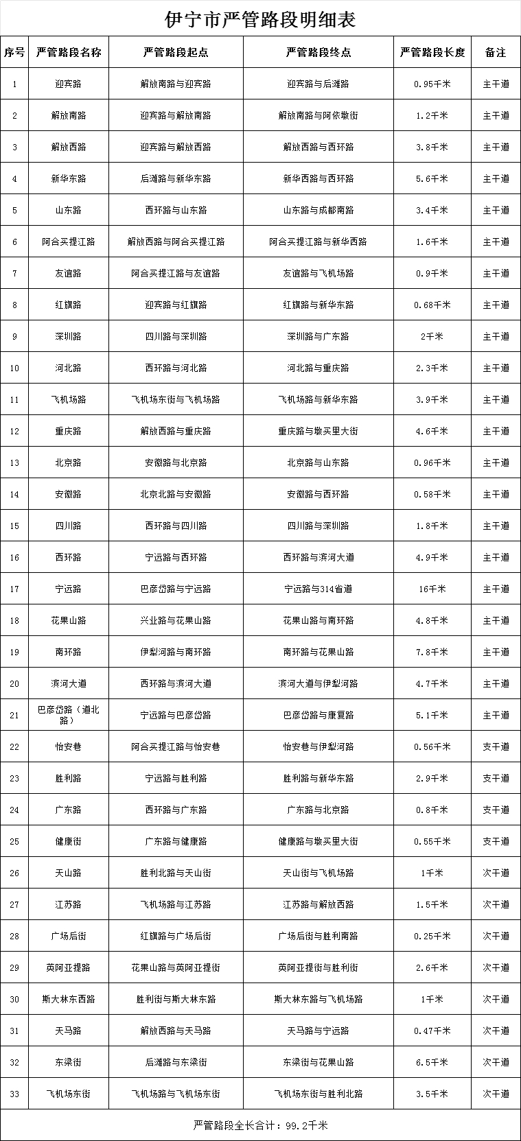为进一步加强伊宁市道路交通安全管理,规范道路交通秩序,缓解城市交通拥堵,提升城市文明形象,保障人民群众出行安全与通畅,伊宁市公安局交通管理大队根据《中华人民共和国道路交通安全法》及相关法律法规,决定在我市城区部分路段设立“道路交通严管街”,提升交通管理质量和城市交通文明水平,努力营造“行车有序、停车规范、道路顺畅、群众满意”的道路交通环境,现将“严管街”情况通告如下: