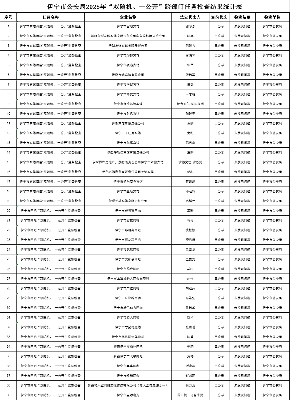 伊宁市公安局2025年“双随机、一公开”跨部门任务检查结果统计表