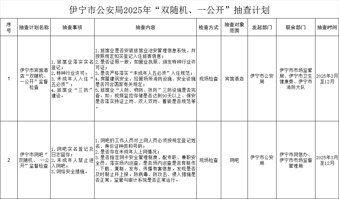 伊宁市公安局2025年“双随机、一公开”抽查计划