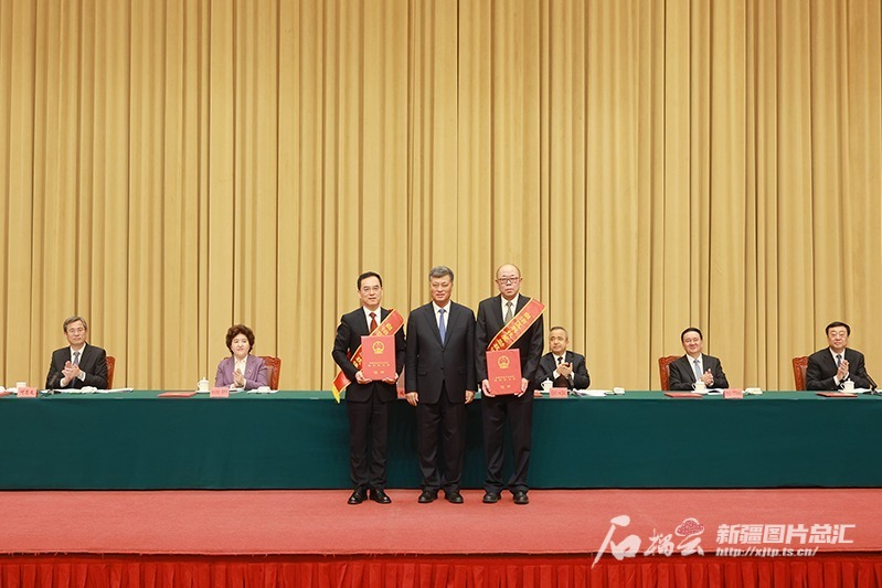 11月20日上午,新疆科技创新大会在乌鲁木齐召开。自治区党委书记、兵团党委第一书记、第一政委马兴瑞为获得自治区科学技术奖特等奖的中石油新疆油田分公司首席专家唐勇(右)和中国科学院新疆理化技术研究所研究员潘世烈颁奖。石榴云/新疆日报记者崔志坚摄