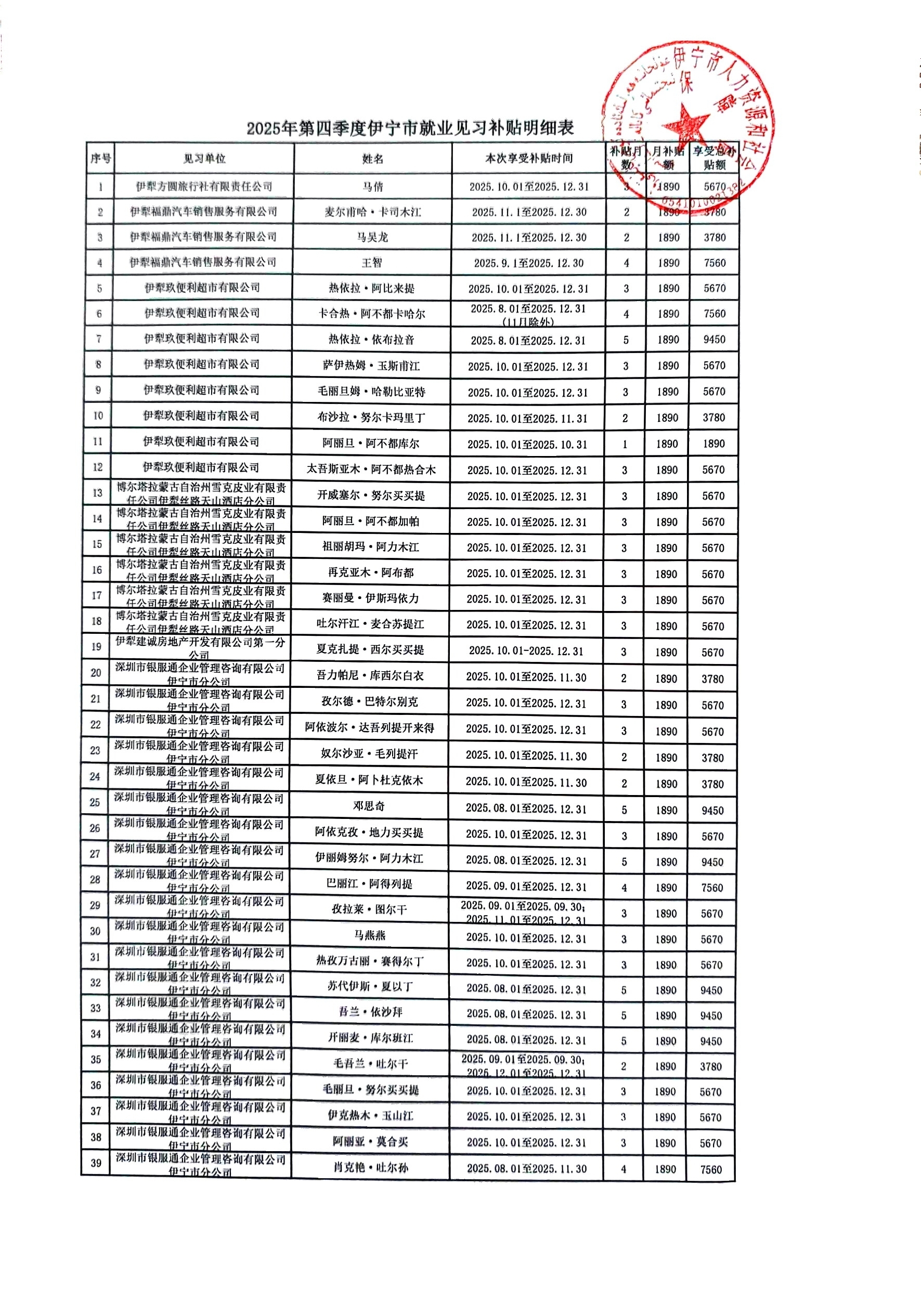 根据《关于实施就业见习岗位募集计划的通知》(新人社[2023]51号),经就业服务中心受理,初审,复核,审批程序后,现将深圳市银服通企业管理咨询有限公司伊宁市分公司、伊犁玖便利超市有限公司等6家见习基地,符合享受伊宁市就业见习补贴的人员名单予以公示,涉及39人23.4360万元。