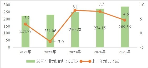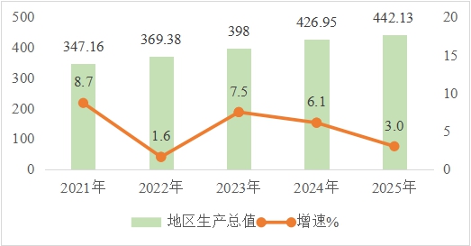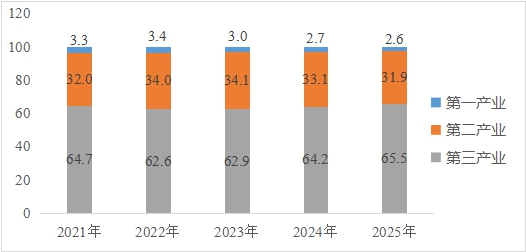 根据地区生产总值统一核算结果,2025年,伊宁市实现生产总值442.13亿元,按不变价计算,同比增长3.0%。第一产业实现增加值11.35亿元,同比增长0.6%;第二产业实现增加值141.22亿元,同比持平;第三产业实现增加值289.56亿元,同比增长4.6%。三次产业结构为“2.6:31.9:65.5”,呈现“三二一”型发展态势。