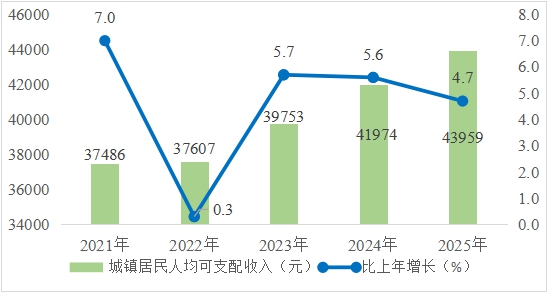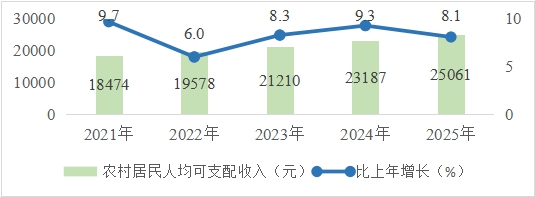2025年,按常住地分,全市城镇居民人均可支配收入43959元,比上年增长4.7%;农村居民人均可支配收入25061元,比上年增长8.1%。