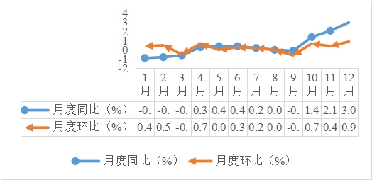 全年居民消费价格指数(CPI)100.4,比上年上涨0.4%。服务项目价格比上年上涨1.6%。消费品价格比上年下降0.2%。