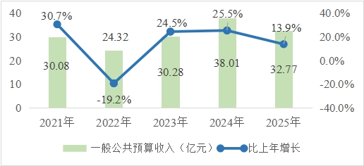 2025年,全市一般公共预算收入完成32.77亿元,比上年增长13.9%。其中,税收收入23.58亿元,增长1.6%;非税收入9.19亿元,增长65.0%。一般公共预算支出92.22亿元,比上年增长14.6%。其中,教育支出增长5.8%;城乡社区事务支出增长39.6%;农林水支出增长65.2%;社会保障和就业支出增长2.5%;交通运输支出下降14.4%;卫生健康支出增长38.1%;住房保障支出增长39.1%。
