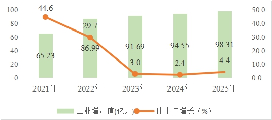 2025年,全市全部工业增加值98.31亿元,比上年增长4.4%。规模以上工业增加值增长6.0%。在规模以上工业中,按产品用途看,轻工业增加值增长2.2%;重工业增加值增长8.3%。分门类看,采矿业暂无规上企业;制造业增长8.7%;电力、热力、燃气及水生产和供应业下降1.8%。