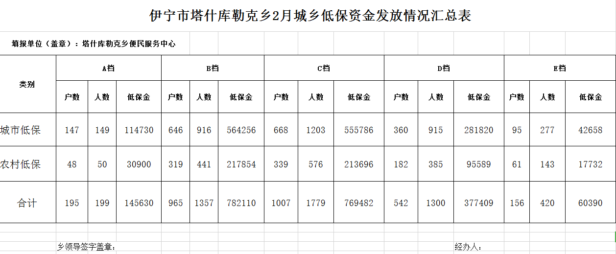 伊宁市塔什库勒克乡2026年2月低保统计表