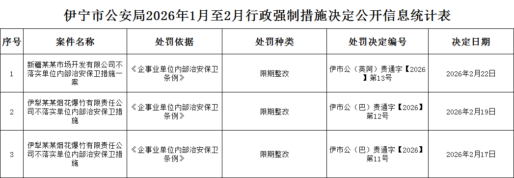 伊宁市公安局2026年1月至2月行政强制措施决定公示公开