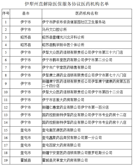 其中伊宁市12家定点医疗机构医保服务协议被解除
